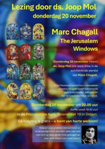 Op donderdagavond 20 november neemt ds. Joop Mol ons weer mee in de schitterende wereld van Marc Chagall. In het Hadassah-ziekenhuis in Jeruzalem ontwierp Chagall twaalf betoverende glas-in-loodramen, één voor elk van de twaalf stammen van Israël.