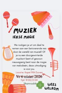 We nodigen je uit om deel te nemen aan een betoverende reis door de wereld van muziek! Of je nu een doorgewinterde muzikant bent, of gewoon nieuwsgierig bent naar de magie van melodieën, deze uitnodiging is voor jou. Een avond met live muziek door ons ‘eigen’ folk ensemble.